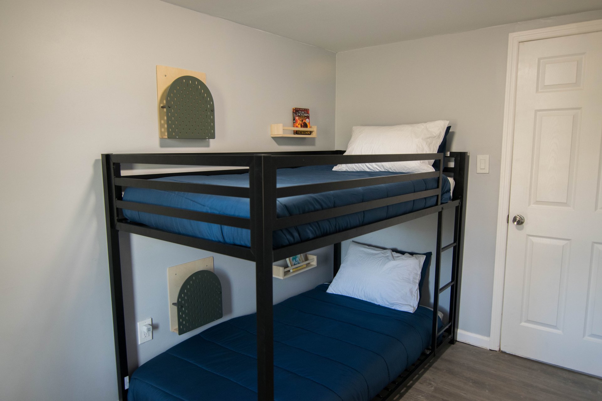 The master bedroom has a queen bed.  The second bedroom has a bunk bed with two twin mattresses.  In the living room there is a pull-out couch with a full size mattress.  Contact us if you'd like to sleep more than four guests.