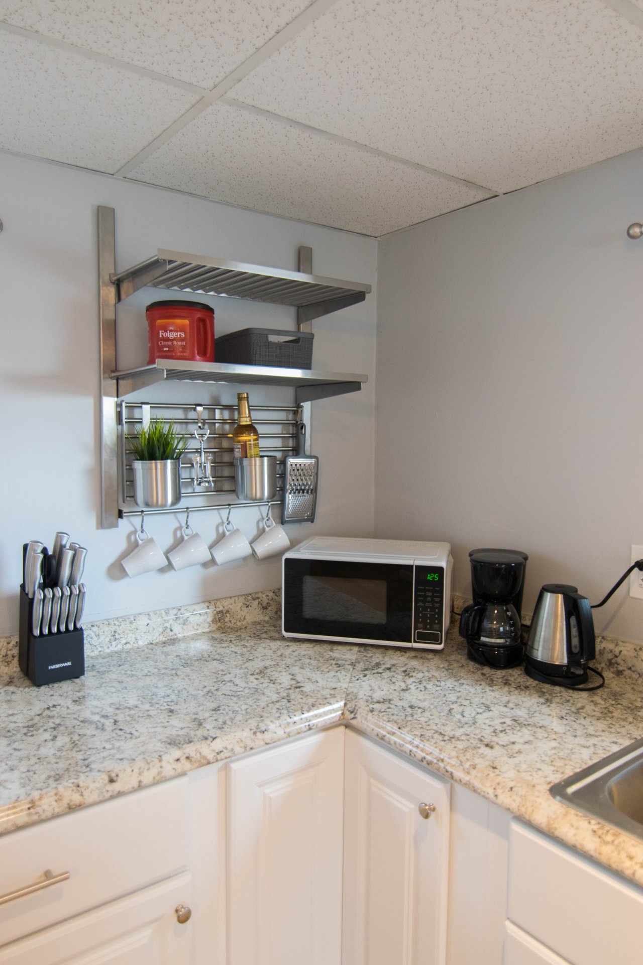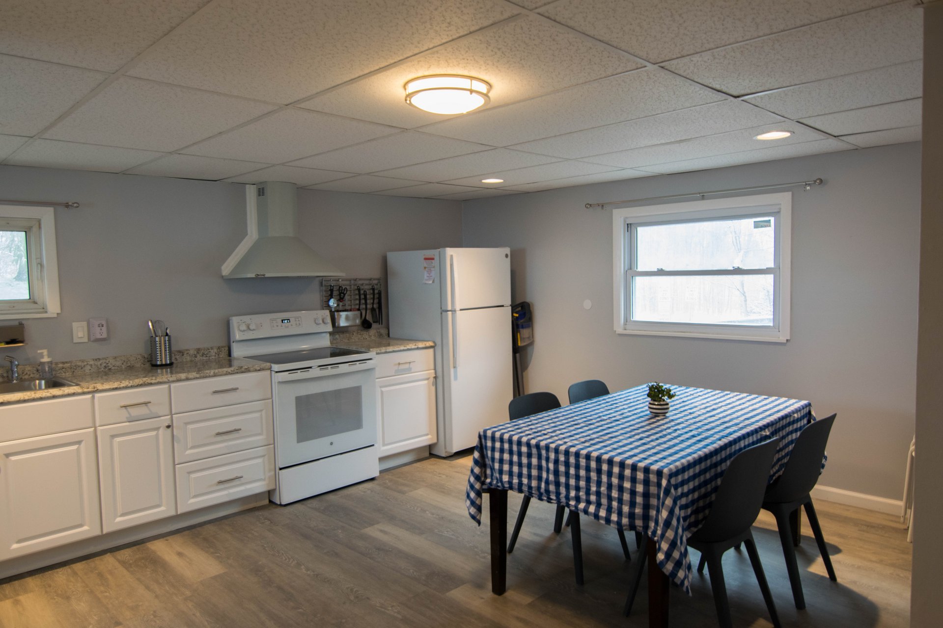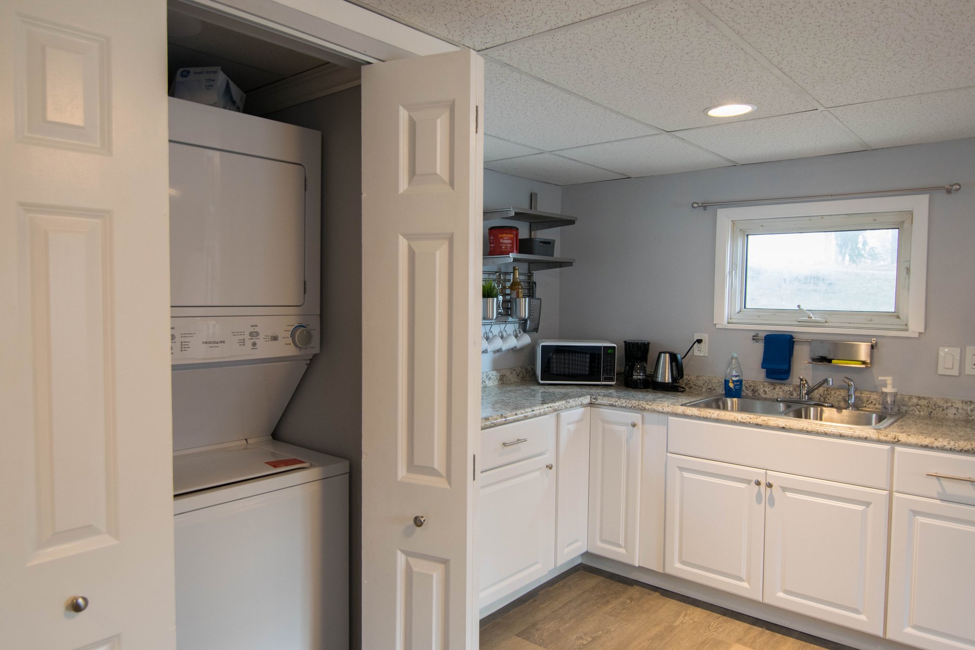 The fully equipped kitchen has an oven, full size refrigerator, double sink with disposal, and basic kitchen appliances.  We also provide cooking utensils, pots and pans, and dishware.  The table seats four comfortably with an option to bring out an extra chair.